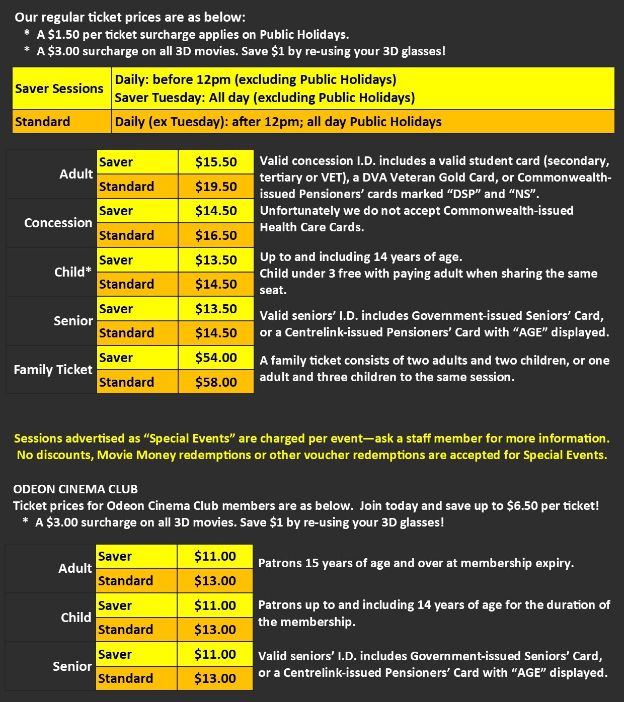 Concession members $11.00 for Saver sessions, $13.00 for Standard sessions.